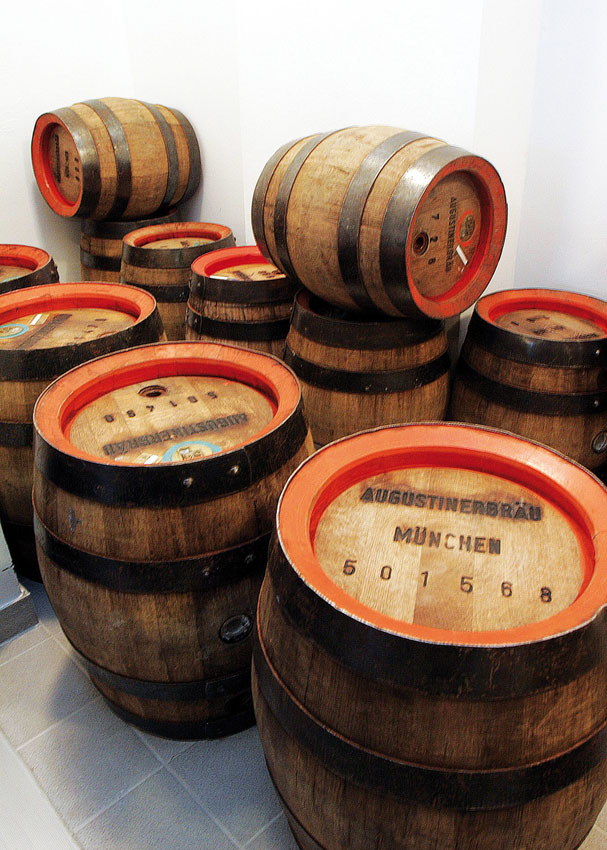 Jeden Tag um 18 Uhr ertönt die Glocke zum großen Holzfass-Anstich von bestem Augustiner Edelstoff. Ein gläserner Fahrstuhl bringt täglich am Abend ein Original Augustiner Holzfass aus unserem Bierkeller an den Tresen. Das schmeckt nach Feierabend. „Grüß‘ Gott und Prost beinand!“ – täglich, solange der Vorrat reicht