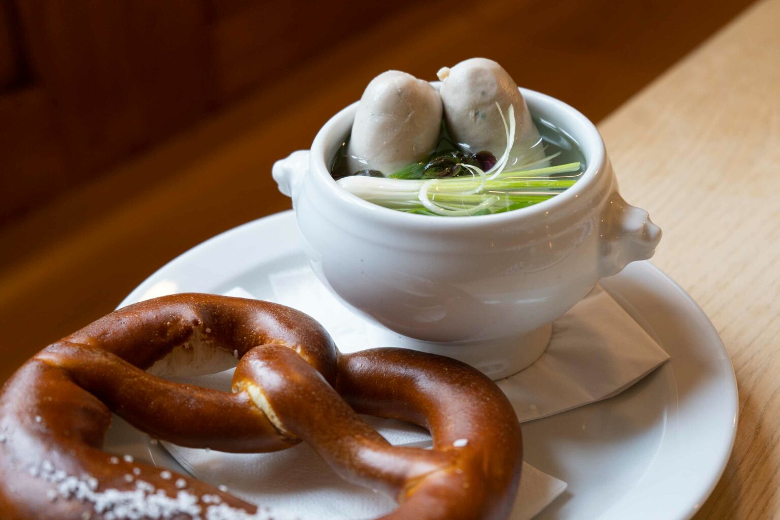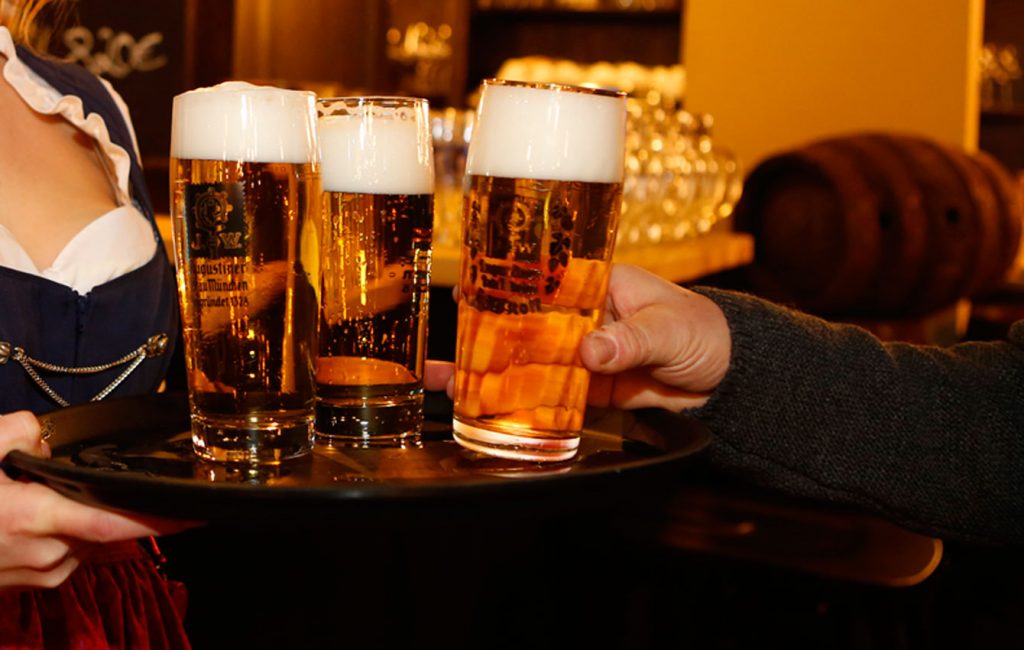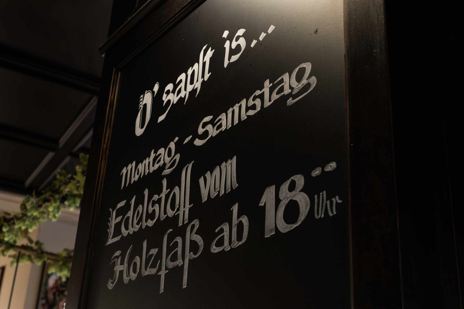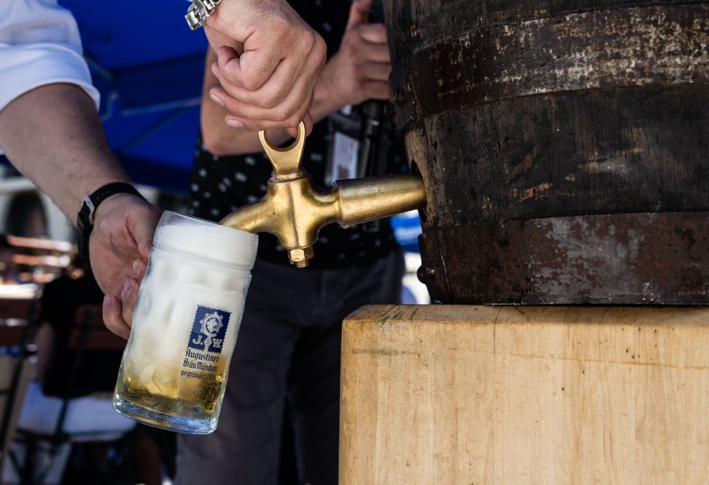 Jeden Tag um 18 Uhr ertönt die Glocke zum großen Holzfass-Anstich von bestem Augustiner Edelstoff. Ein gläserner Fahrstuhl bringt täglich am Abend ein Original Augustiner Holzfass aus unserem Bierkeller an den Tresen. Das schmeckt nach Feierabend. „Grüß‘ Gott und Prost beinand!“ – täglich, solange der Vorrat reicht