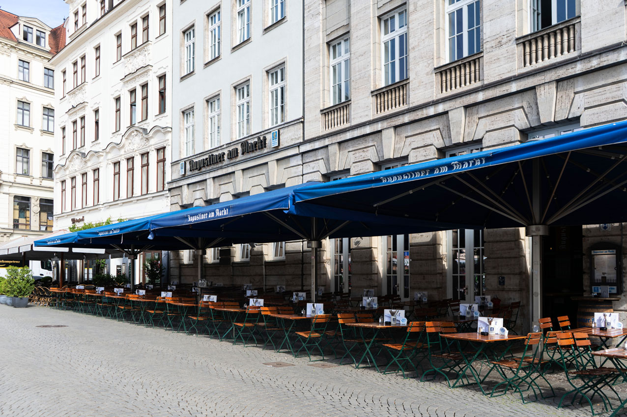 Der schönste Platz auf unserer großen Marktplatz-Terrasse vor dem Haus gehört Ihnen! Mit einer erfrischenden Maß Bier bei Weißwurst & Brezn oder deftigen bayrischen Schmankerln lässt es sich hier ganztägig wunderbar entspannen. Genießen Sie den weiten Blick über Leipzigs schönen Marktplatz. Oder besuchen Sie auch unseren lauschigen Innenhof!