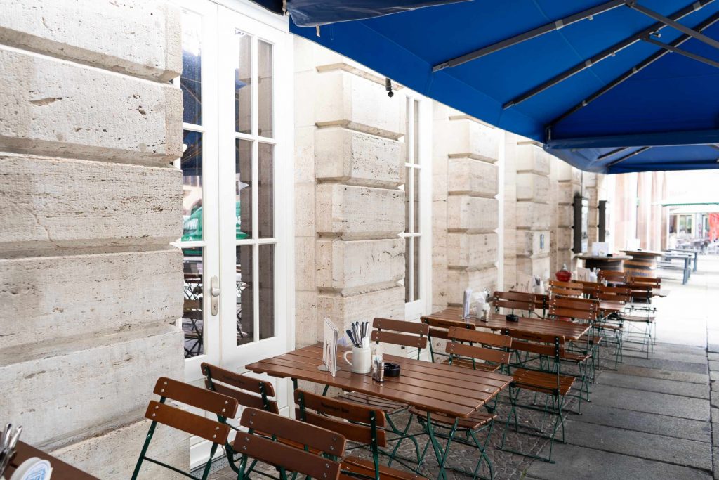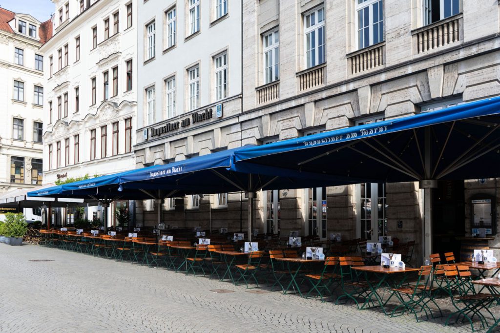 Unsere prominente Terrasse ist mit ihrer Lage und dem unverbautem Blick auf den historischen Marktplatz von Leipzig seit Jahren ein Anziehungspunkt für Einheimische, Stammgäste, Marktbesucher und Touristen aus aller Welt.